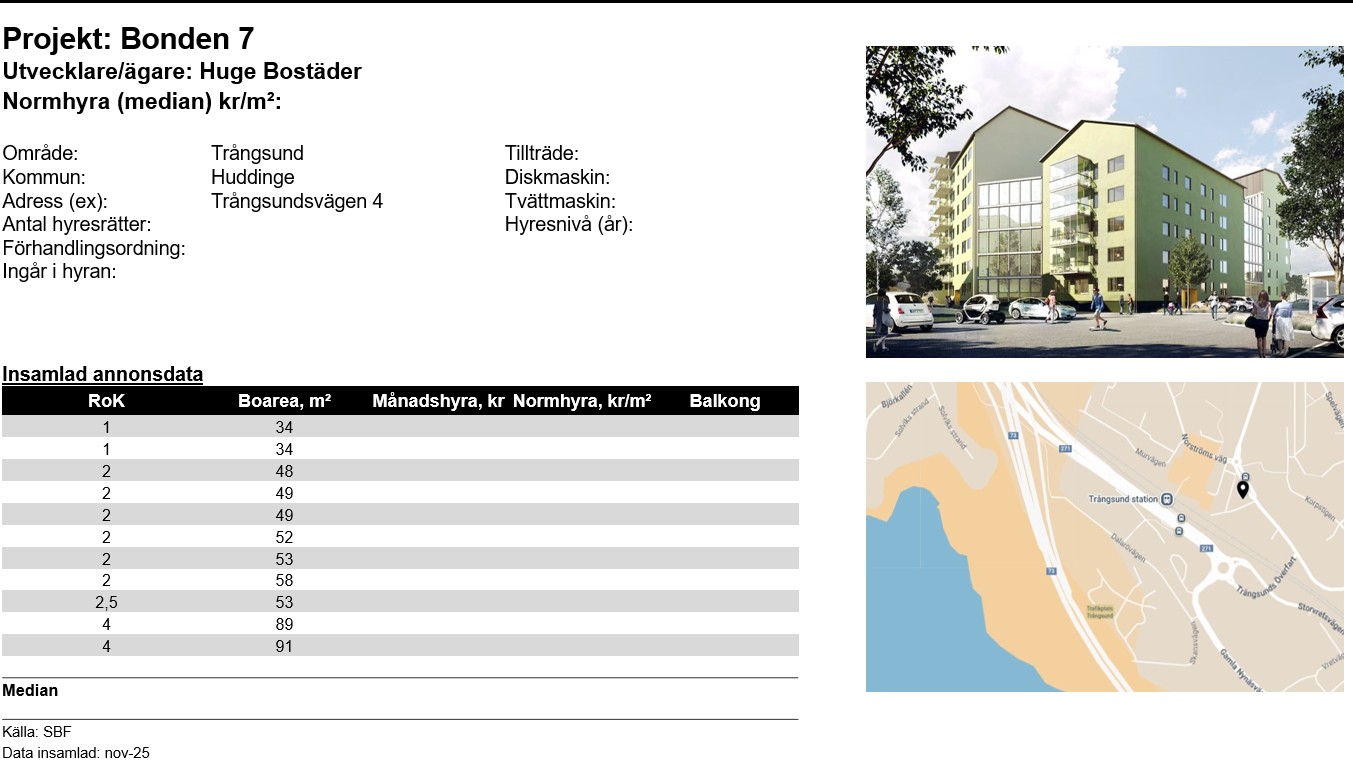 Hyror och en mängd parametrar från annonserade nyproducerade hyresrätter samlas in och sammanställs