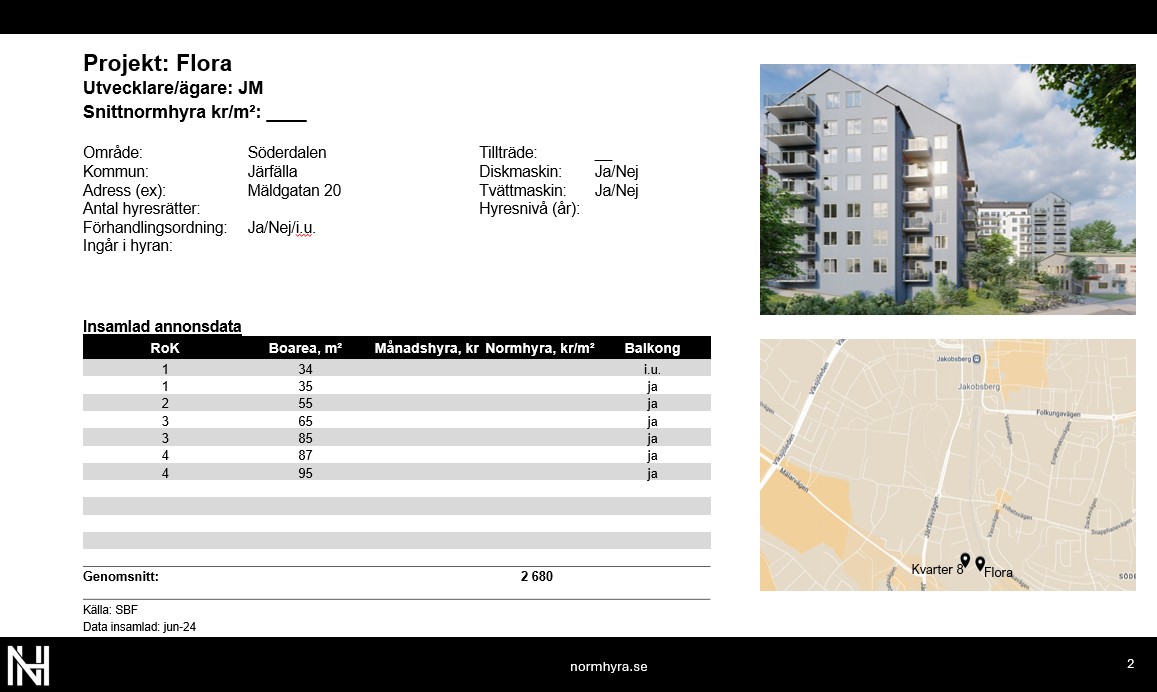 Respektive projekt beskrivs med hjälp av karta, bild och projektspecifik information. Dessutom presenteras en lista av insamlade annonser med lägenhetsspecifika parametrar samt den beräknade snittnormhyran för projektet